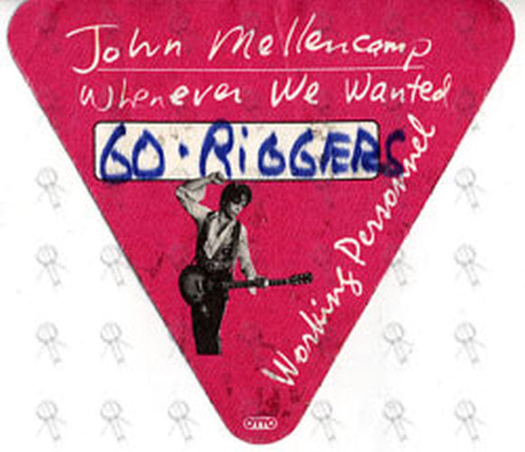 Pink, black and white, used working personnel cloth sticker pass with John Mellencamp 'When Ever We Wanted, Working Personnel' titles and image on front. Approximately 4" x 4" in size.